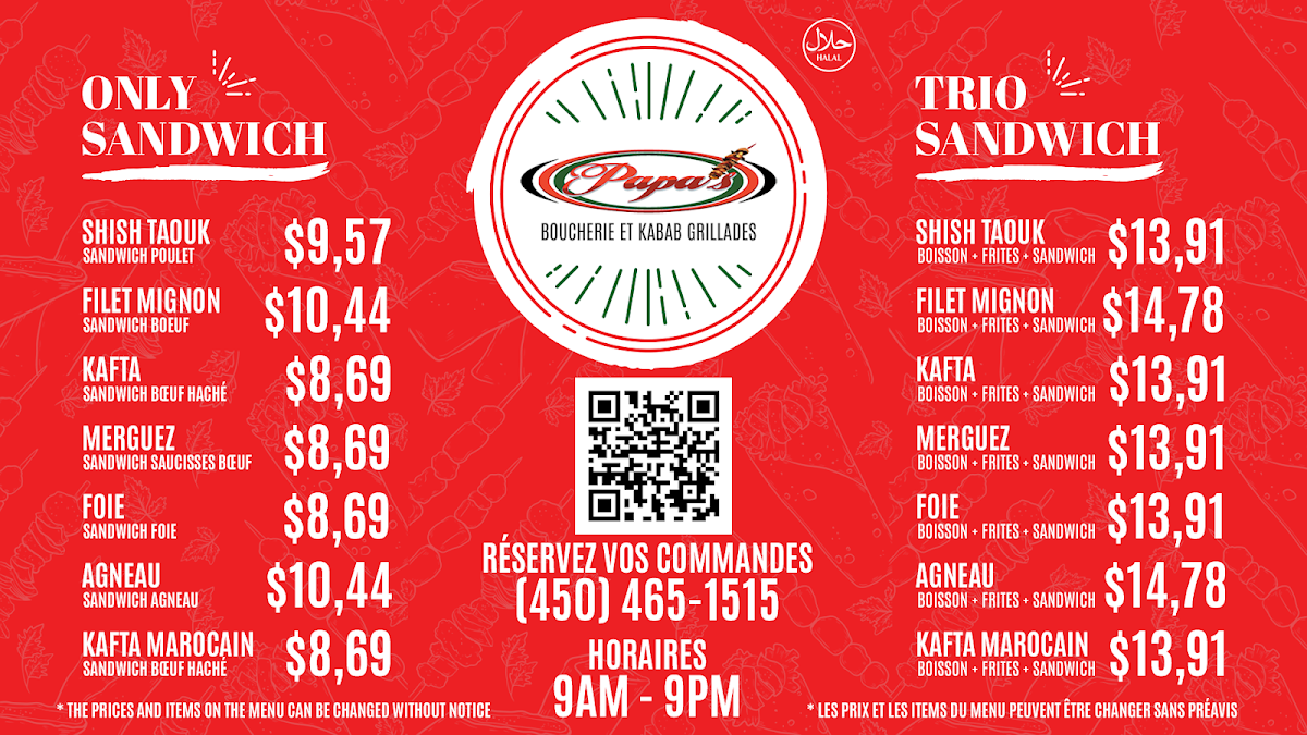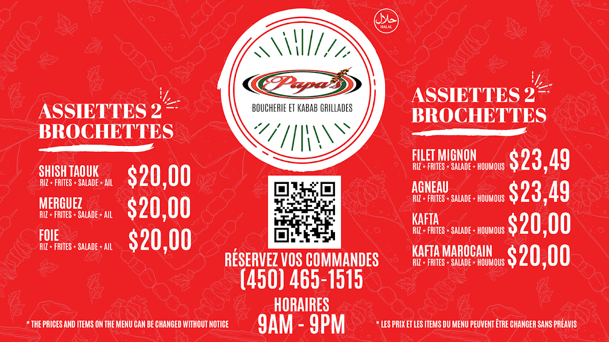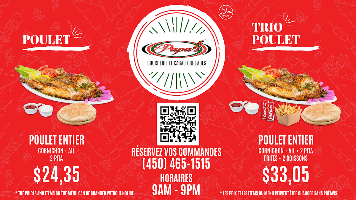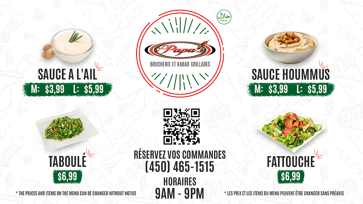 The menu at Papa's Boucherie Et Kabab Grillades offers a variety of grilled meats and traditional Middle Eastern dishes, suitable for casual dining and takeaway. It features a combination of restaurant and butcher shop selections, providing both prepared meals and options to purchase meats.