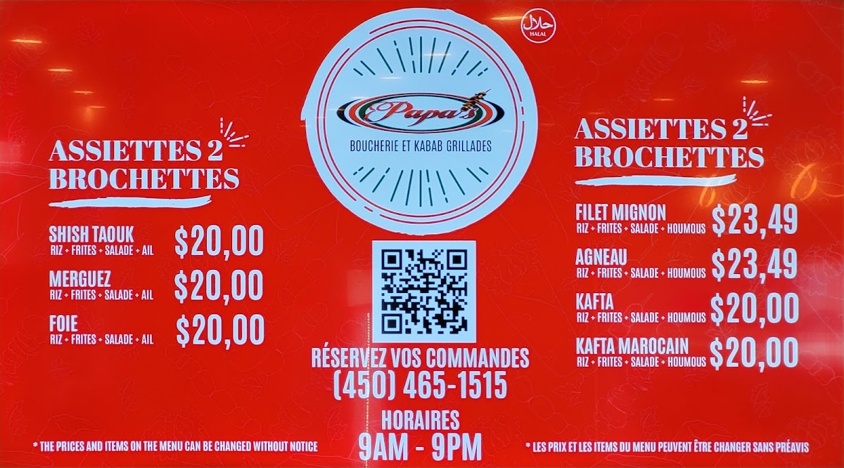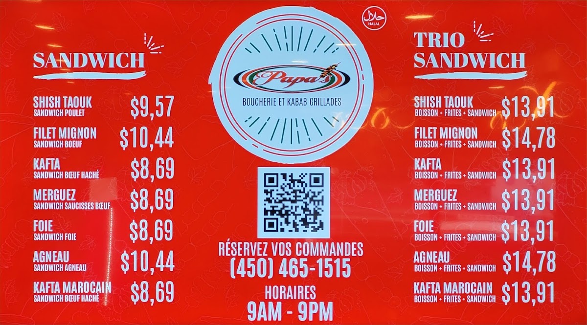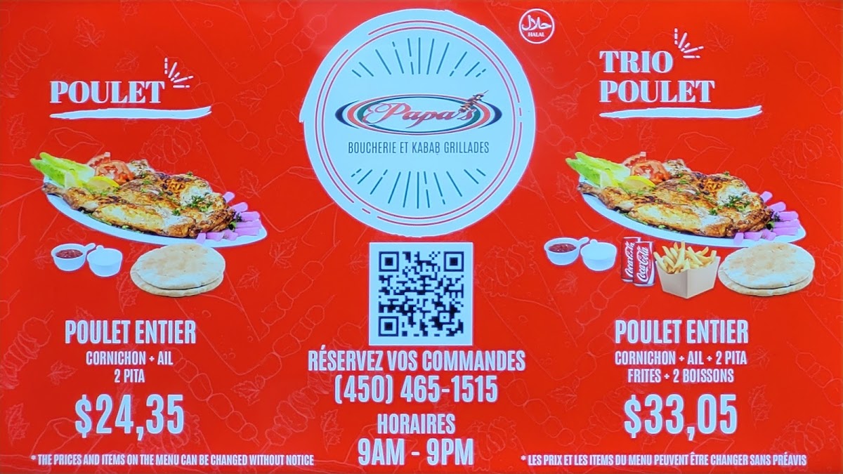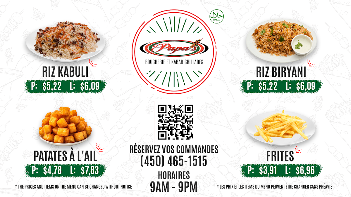 The menu at Papa's Boucherie Et Kabab Grillades offers a variety of grilled meats and traditional Middle Eastern dishes, suitable for casual dining and takeaway. It features a combination of restaurant and butcher shop selections, providing both prepared meals and options to purchase meats.